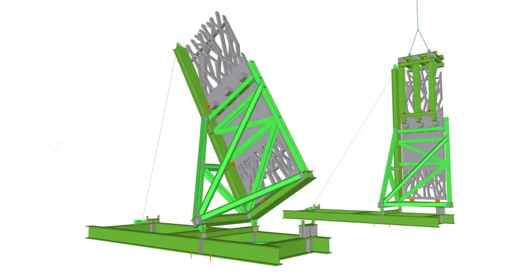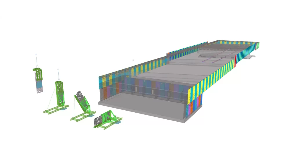 De laatste stap van het proces was het vervoeren en plaatsen van de randelementen. De grootste uitdaging zat in het verzinnen van een manier om de elementen heel uit de kist te krijgen, te transporteren, te kantelen en de elementen te hijsen zonder dat deze beschadigd raken. Aan de dunne structuur kan namelijk niet worden gehesen of op worden gesteund of gekanteld. Door het proces te simuleren in het Tekla Structures-model zijn we hierin geslaagd.