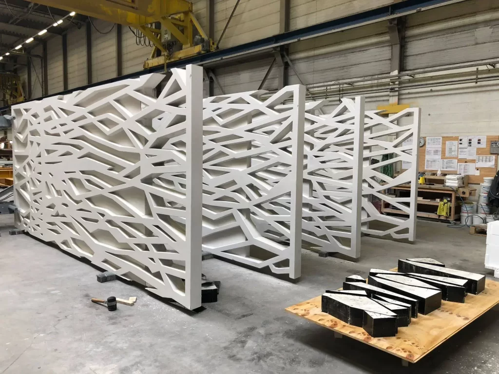 Tijdens het project werd er met verschillende partijen nauw samengewerkt. De nauwkeurige uitwerking, uitwisseling aan de hand van 3D-modellen en exportbestanden voor de mallenmaker en wapeningsleverancier hebben gezorgd dat alles juist geproduceerd en gemonteerd is. De informatie-uitwisseling met de mallenmaker en de wapeningsleverancier verliep in alle gevallen via een DWG-export van de elementen vanuit Tekla Structures waarbij IFC-modellen gebruikt werden voor extra inzicht. De mallenmaker zette vervolgens voor het uitfrezen van de malbodem de DWG-export van de vorm om naar een CNC-freesbestand waarmee de machine direct werd aangestuurd. Om alle takken te voorzien van een wapeningstaaf, rekening houdend met kruisingen, was er een structuur van drie lagen nodig. Deze konden door de wapeningsleverancier exact worden overgenomen vanuit de export en worden samengevoegd tot één net, waarbij elke tak minimaal één thermisch verzinkte wapeningsstaaf in het midden heeft liggen. Om vervolgens de randelementen aan te laten sluiten aan het dek werden de IFC-modellen aangeleverd bij de hoofdaannemer welke de controle op hoofdmaatvoering en koppeling op het dek uitvoerde. Het stekkenplan werd in DWG-formaat aangeleverd, waardoor clashcontroles vooraf konden worden uitgevoerd en verrassingen tijdens de uitvoering zijn voorkomen.